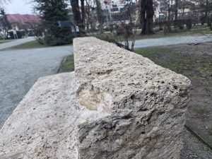 Bancă distrusă la Ansamblul Brâncuși din Târgu Jiu